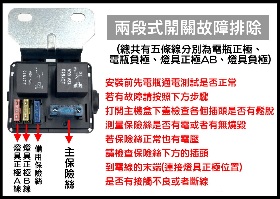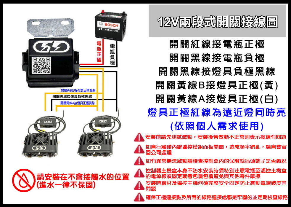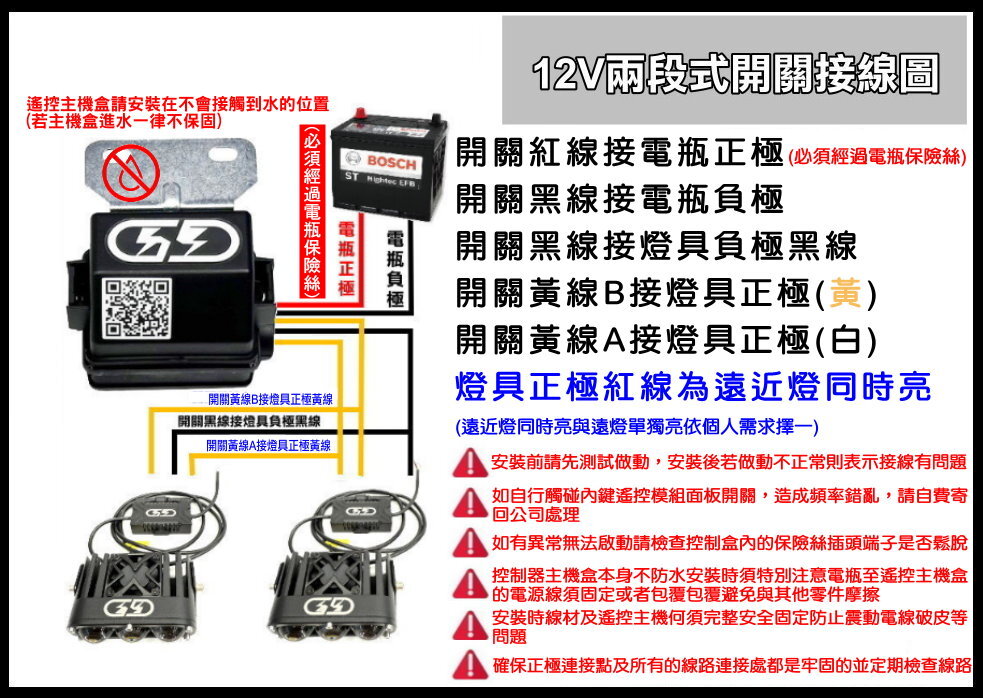 -燈具安裝建議交由保養廠以專業技術安裝,若自行DIY安裝,需確認檢查電瓶正負極鎖點及各個電線連接處是否緊固並且定期檢查,以防發生線路短路問題