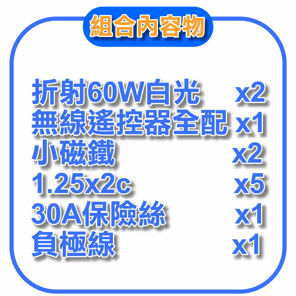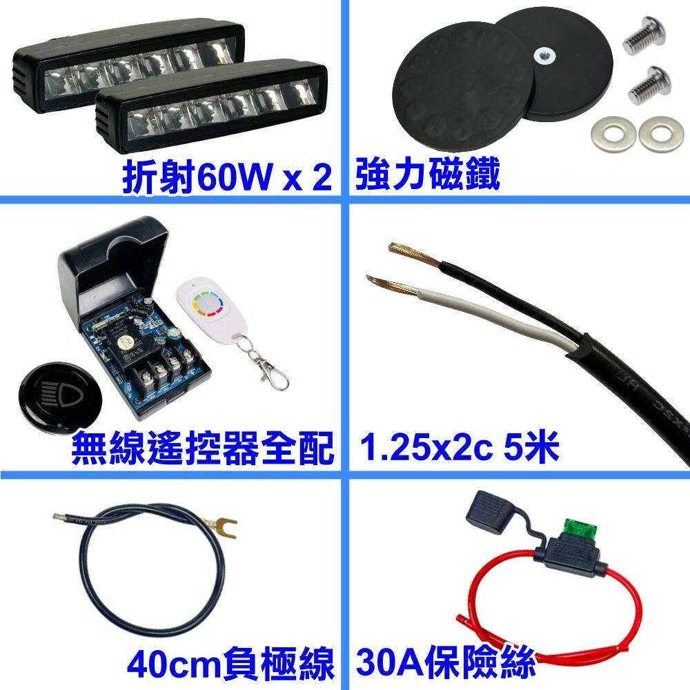 折射60W白光 x2+大磁鐵x2+無線遙控器全配x1+1.25x2c 5米+30a保險絲x1+負極線x1