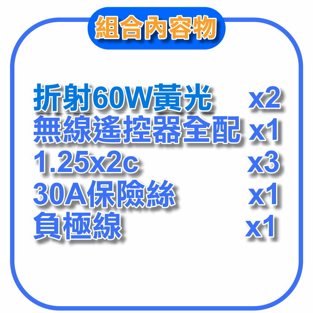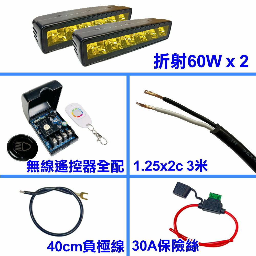 折射60W黃光 x2+無線遙控器全配x1+1.25x2c 5米+30a保險絲x1+負極線x1
