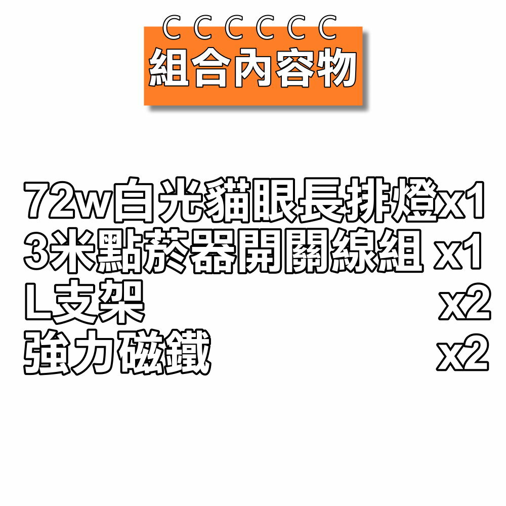 72W貓眼白光x1+3米點菸器開關線組x1+L支架x2+強力磁鐵x2